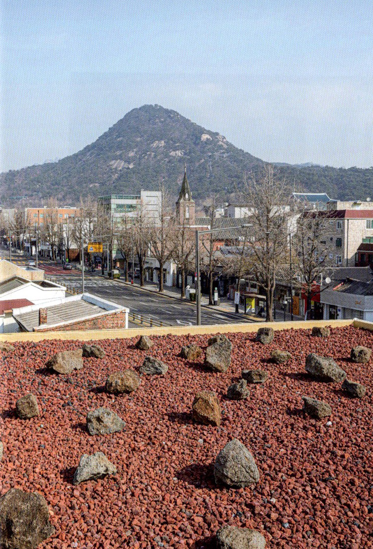 맑은 날에는 연못 수면에 하늘이 그대로 비쳐 마치 하늘을 담은 그릇처럼 빛나는 풍경을 연출한다. 루프탑에는 경복궁 근정전의 박석에서 영감을 얻은 돌을 배치해 비 오는 날이면 돌 위로 빗물이 흐르는 모습을 바라볼 수 있다.